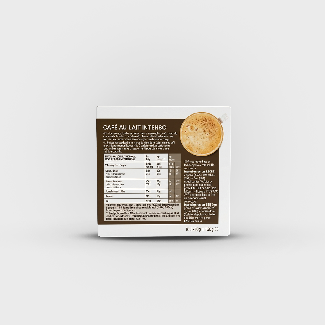 استمتع بتجربة قهوة بالحليب غنية وقوية مع Nescafé Dolce Gusto Café Au Lait Intenso، مزيج متوازن يجمع بين قوة القهوة المحمصة وطعم الحليب الكريمي في كوب واحد.